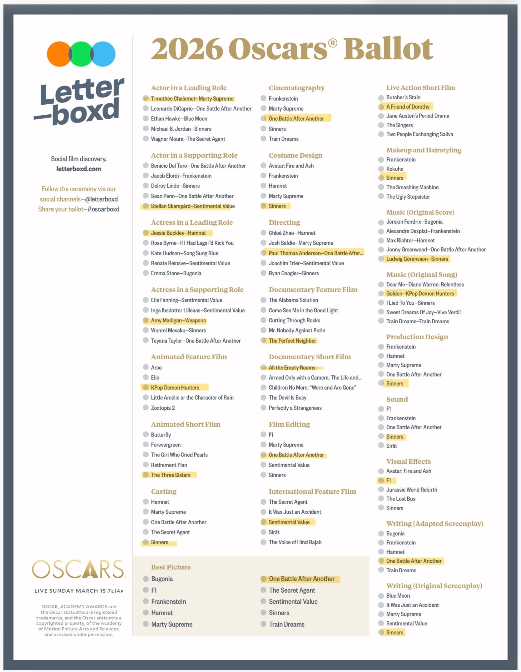 I’ve shared my predictions below, though I’ll confess that I hope to be surprised this year. My hunch is that One Battle After Another will be duly rewarded by the Academy in the major categories, including Picture, Director, and Adapted Screenplay. I think we’ll see Sinners relegated to the more technical races, though perhaps an Original Screenplay win will keep us guessing throughout the night. Sentimental Value, despite its strong showing in the nominations, will likely be shut out outside of the International category, unless Stellan ekes out a Supporting Actor win. Given the Academy’s fondness for Sinners this year, I also think we might see another horror film rewarded, with Madigan taking Best Supporting Actress for Weapons. The Academy has been reluctant to celebrate Timothée Chalamet, and we could see a surprise upset in Best Actor. The Twittersphere is pulling for a Wagner Moura upset, but if it isn’t Timmy, it’s more likely to be DiCaprio, Jordan, or even Hawke.